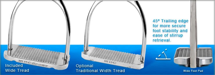 MDC Intelligent Stirrups® are available in various widths from 4 inches to 5 inches to assure every rider the best comfort and safety. All MDC Stirrups™ come in true sizes as we have taken the rubber sleeves into account in our measurements. Ensuring proper fit in a stirrup is an important step in your stirrup selection. For MDC Stirrup™ size recommendations, click here.
